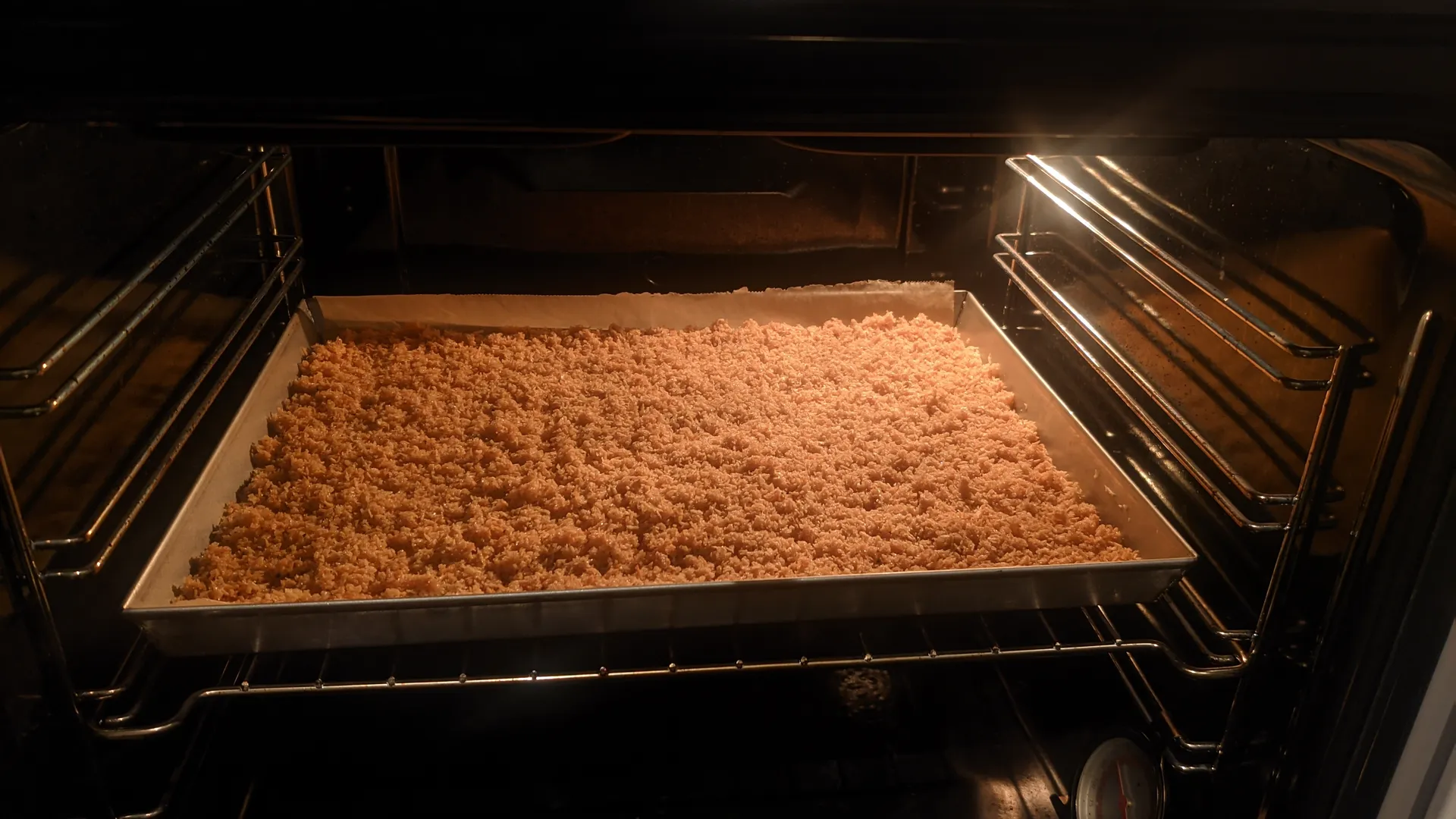 Sekoita ainekset ja levitä pellille. Paahda 150°C ~15 min kunnes seos on tasaisen kullanruskea, sekoittaen välillä. Anna jäähtyä täysin.